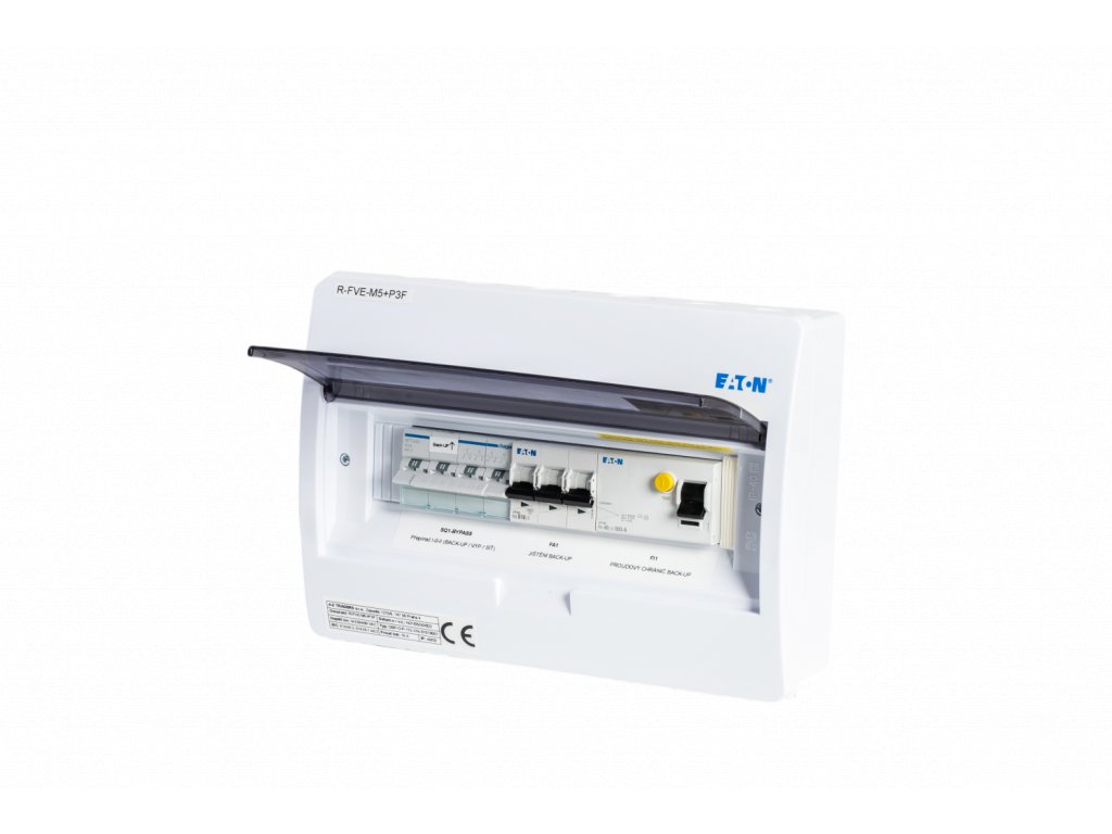 V rozvaděči je osazen jistič B16/3 pro jištění výstupu ze zálohy střídače, proudový chránič typu A a čtyřpolohový manuální přepínač pro přemostění zálohovaných okruhů v době servisu nebo při vypnutí střídače.