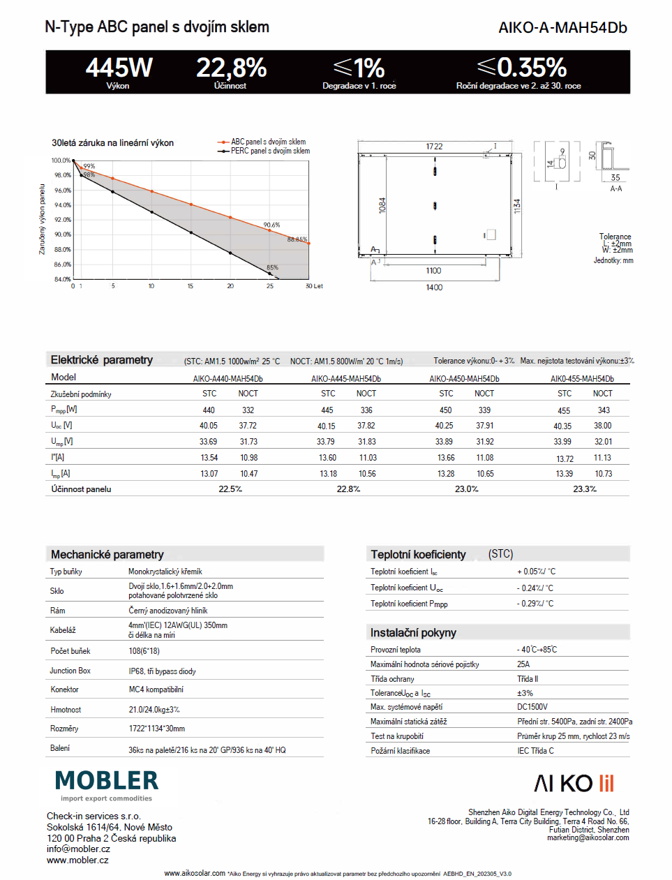 Panel AIK0-445-MAH54Db je vysoce výkonný solární panel s technologií All-Back-Contact (ABC). Díky této technologii dosahuje špičkové účinnosti. Jeho atraktivní celočerný design, bez viditelných kontaktů na přední straně článku, jej činí ideálním pro náročné domácnosti. Tento panel je také vhodný pro větší systémy, kde je klíčová maximální účinnost.