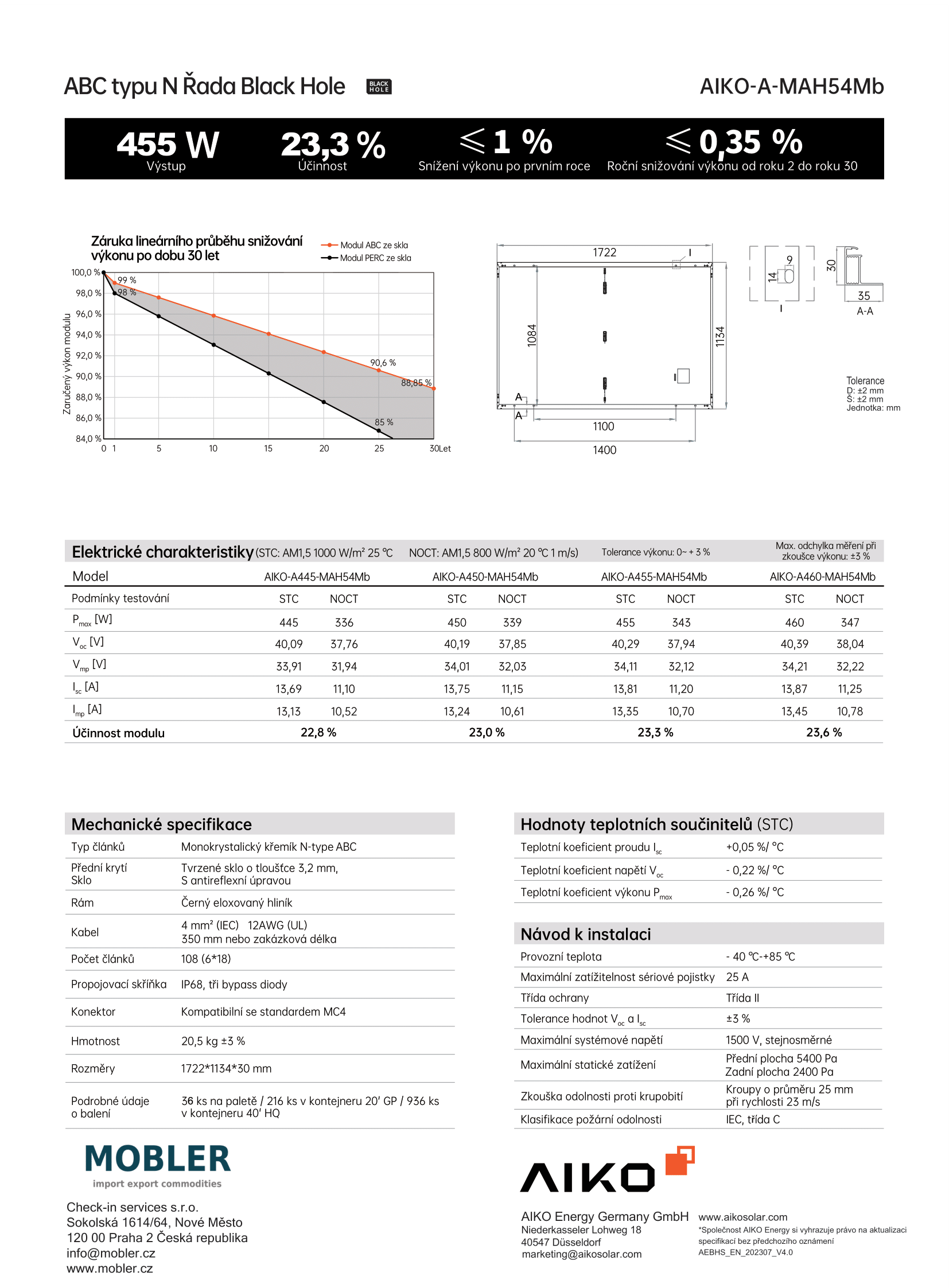 Panel AIKO-455-MAH54Mb je vysoce výkonný solární panel, který dosahuje špičkové účinnosti díky použití solárních článků All-Back-Contact (ABC) vyvinutých společností AIKO. Jeho atraktivní celočerný design, bez viditelných kontaktů na přední straně článku, jej činí ideálním pro náročné domácnosti. Tento panel je také vhodný pro větší systémy, kde je klíčová maximální účinnost.