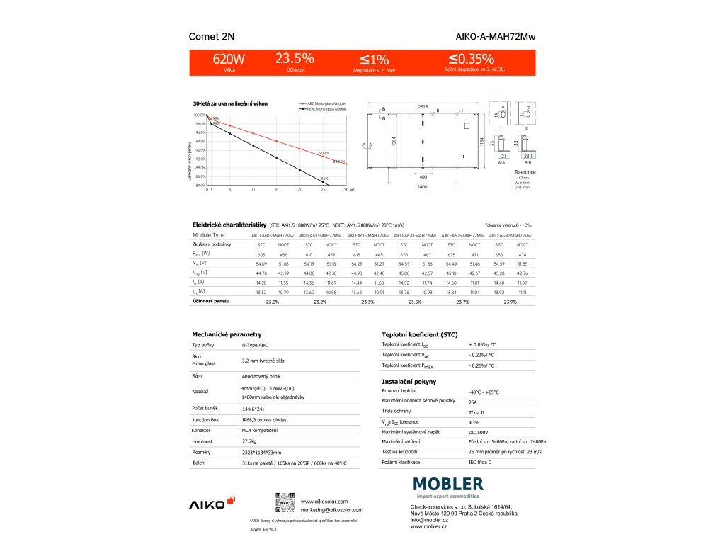 AIKO Comet 2N A620-MAH-72MW je vysoce výkonný solární panel s výkonem 620 Wp, který dosahuje špičkové účinnosti díky využití solárních článků All-Back-Contact (ABC) vyvinutých společností AIKO. Jeho atraktivní design bez předních kontaktů činí tento panel ideální volbou pro náročné domácnosti i pro větší systémy, kde je klíčová maximální účinnost.