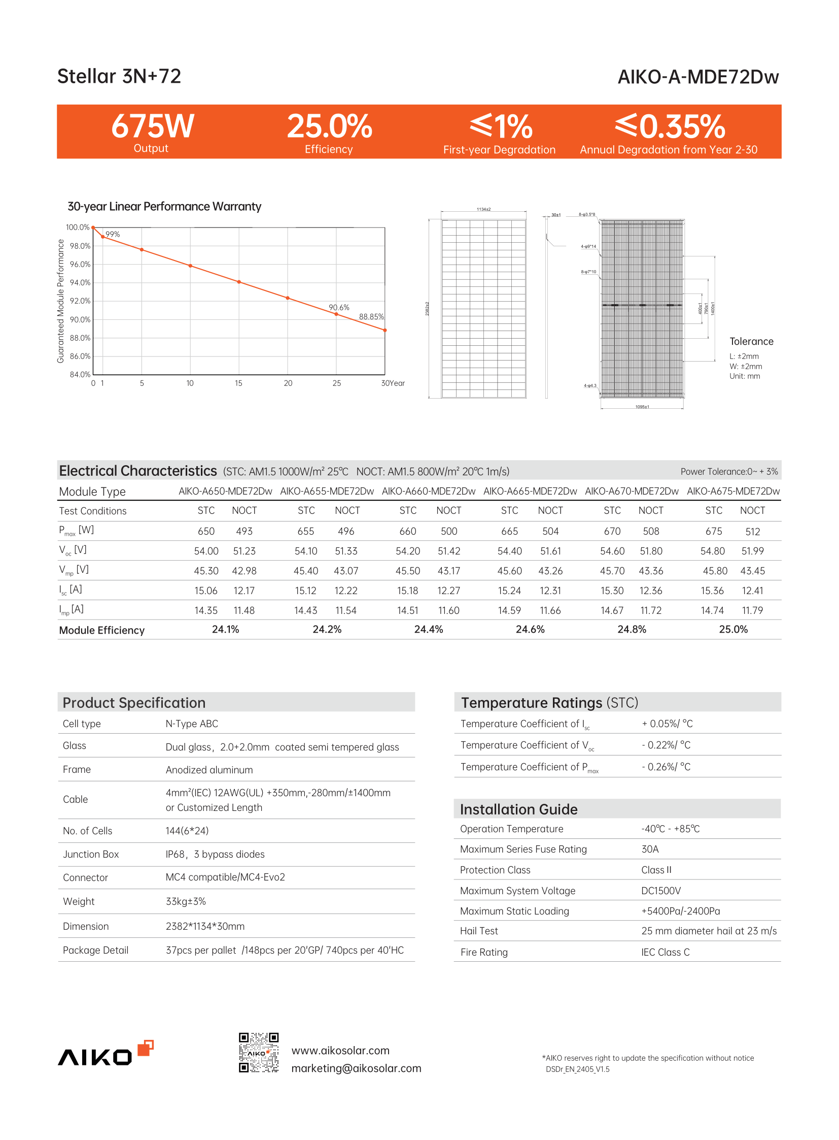 AIKO-A665-MDE72Dw - 3. generace AIK0 - řada Stellar 3N+ Dual-Glass Module - stříbrný rám - výkon 665 Wp