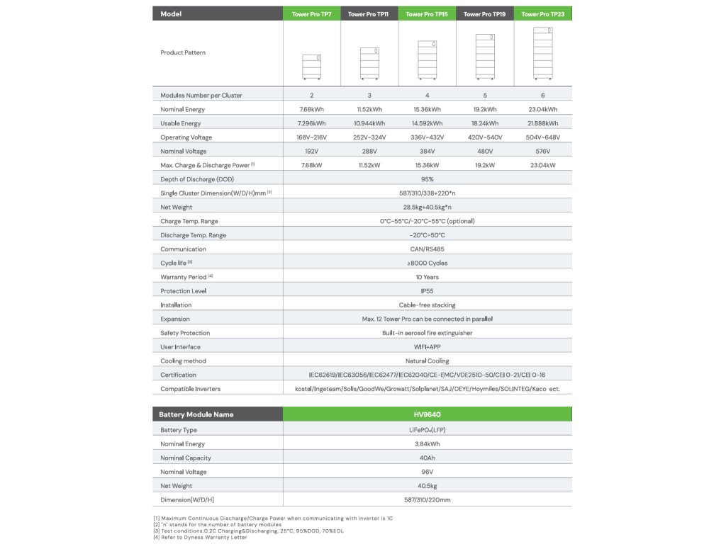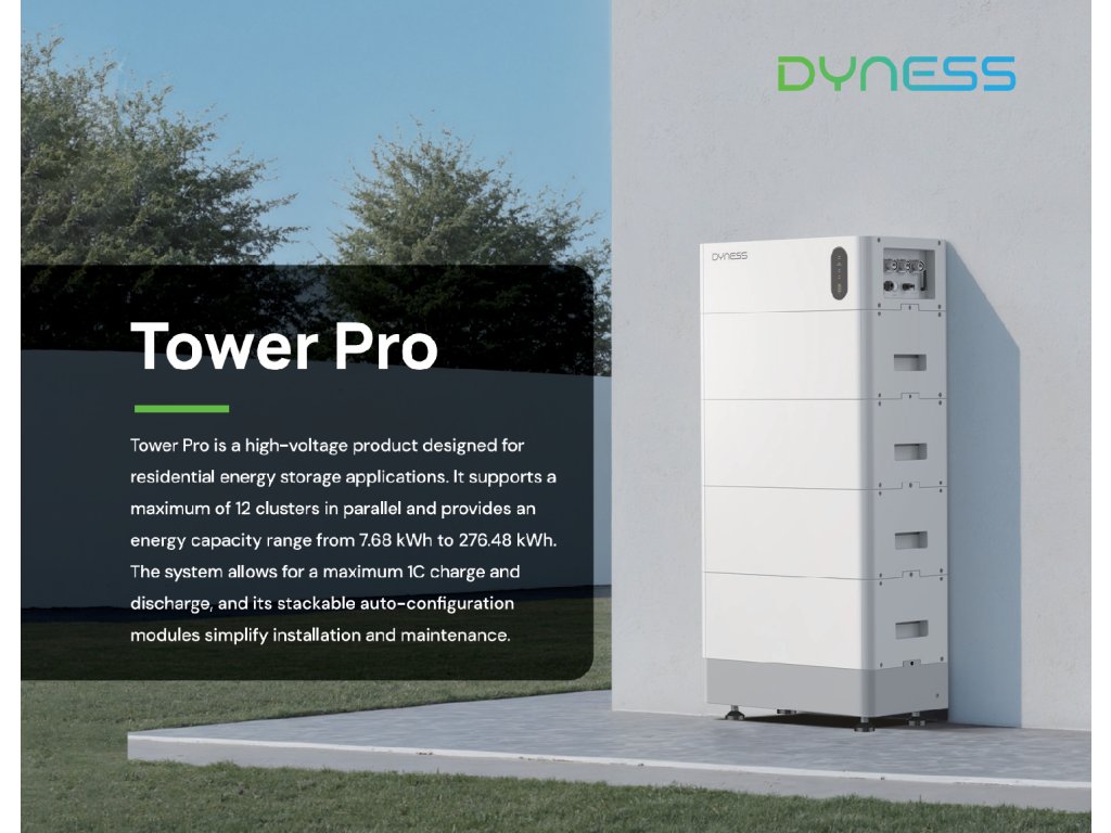 Dyness Tower Pro je prémiová modulární vysokonapěťová bateriová úložná sestava určená pro domácí i komerční použití – ideální pro ukládání energie z fotovoltaických systémů, podporu ostrovního provozu nebo záložní napájení. Série Tower Pro nabízí flexibilní škálování kapacity, vysokou bezpečnost a dlouhou životnost díky moderní LiFePO₄ technologii.