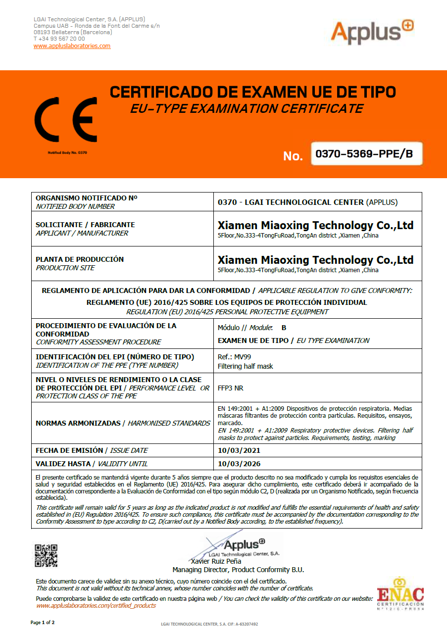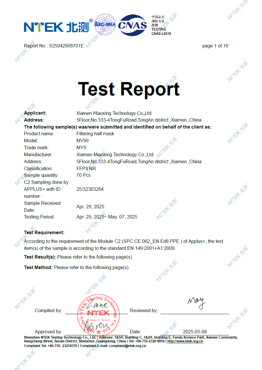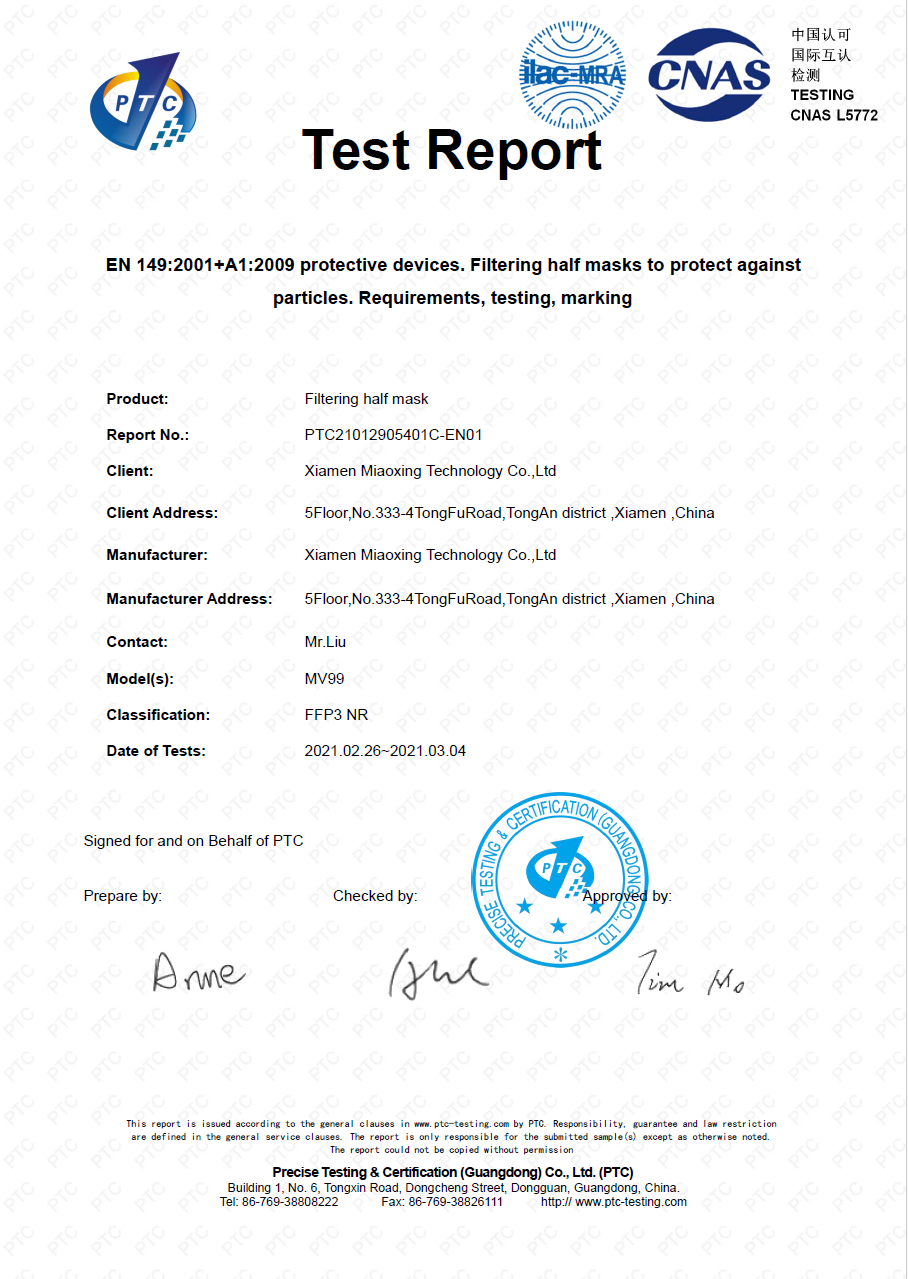 LABORATORNÍ ZKOUŠKA POTVRZUJÍCÍ SHODU S EVROPSKOU NORMOU EN 149:2001+A1:2009