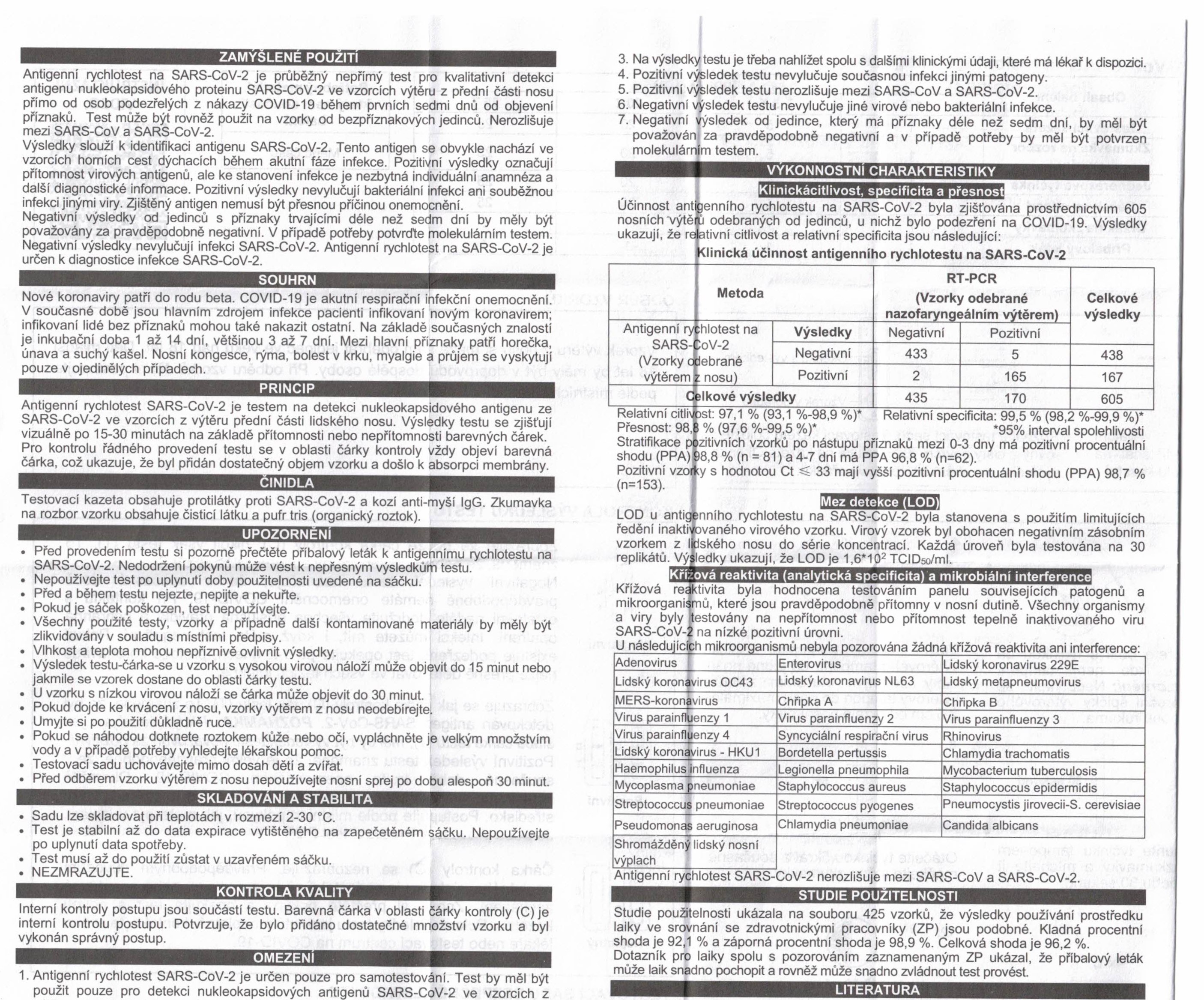 Rychlý test na detekci Antigenu Covid-19 je imunologický test pro kvalitativní detekci specifických antigenů SARS-COV-2 přítomných v nosu člověka. I když výrobce připouští možnost výtěru z nosohltanu nebo krku. Výsledek do 15 minut.