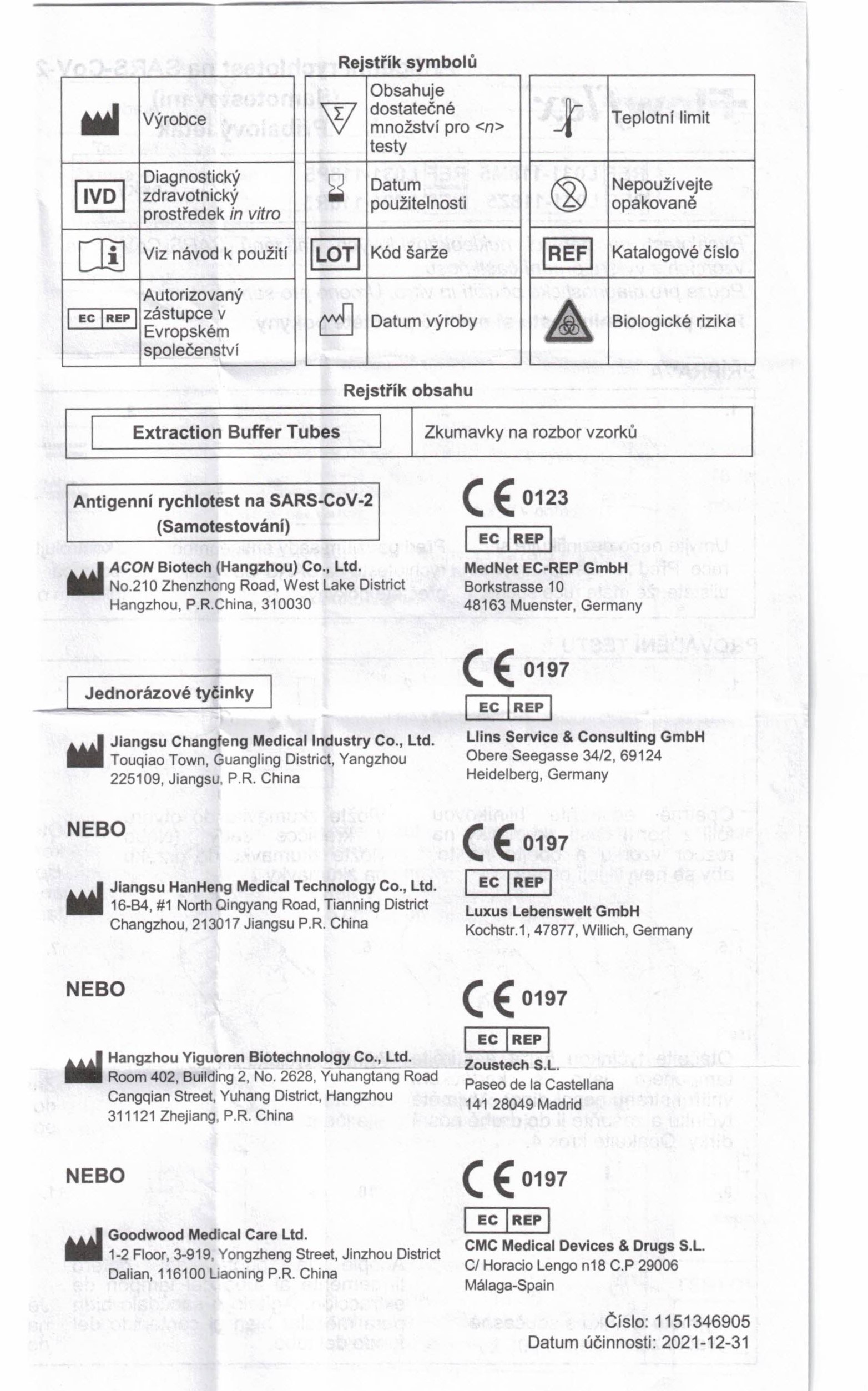 - Výrobce antigenních testů pro které vydalo ministerstvo výjimku podle §4 odst.8 nařízení vlády č.56/2015Sb.