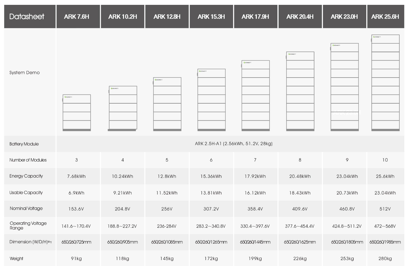 Growatt střídače lze doplnit pouze bateriemi Growatt ARK. Tři až deset ARK 2.5H-A1 lze zapojit sériově a rozšířit tak kapacitu a výkon.