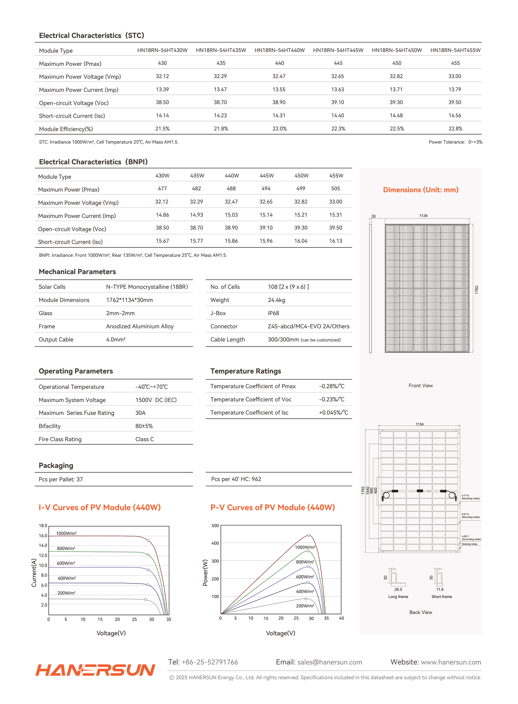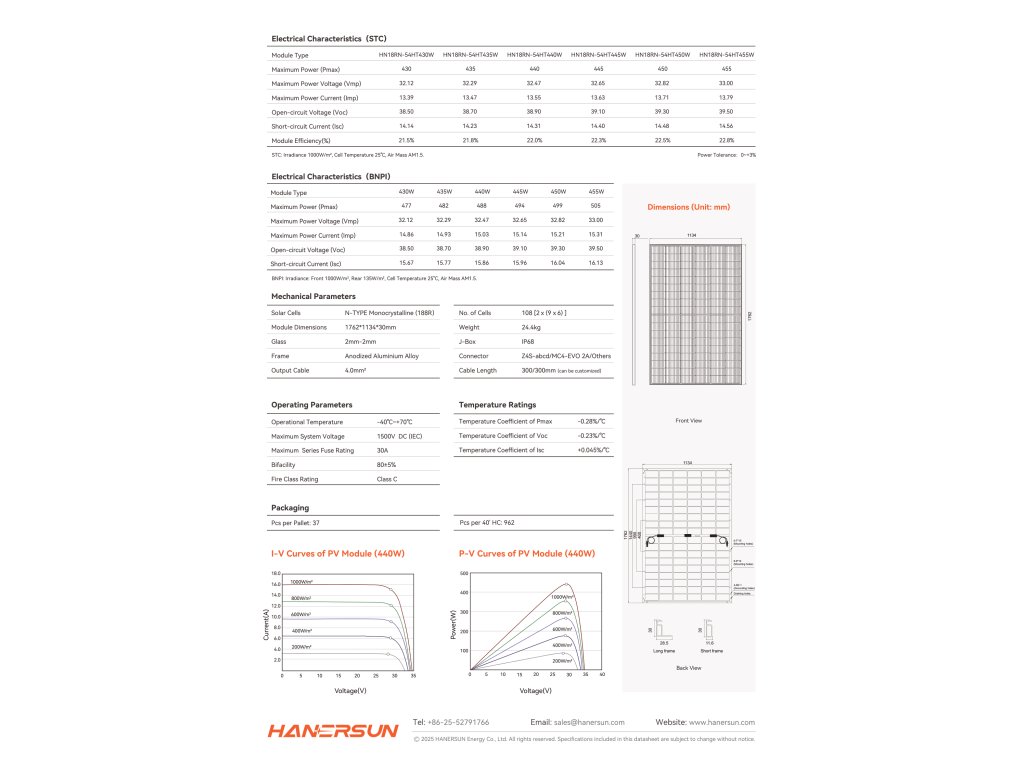 Vysoce účinný bifaciální solární panel HANERSUN HN18RN-54HT450W s výkonem 450 Wp a účinností 22,5 %, ideální pro rezidenční i menší komerční instalace. Díky technologii N-Type TOPCon, half-cut článkům a MBB (Multi Busbar) konstrukci nabízí panel stabilní výkon, nižší ztráty a dlouhou životnost.