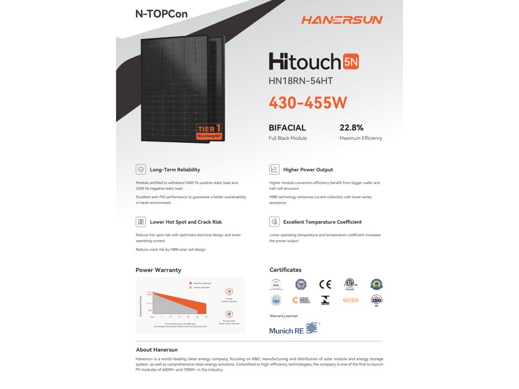 Panel HANERSUN HN18RN-54HT450W je spolehlivou volbou pro instalace, kde je kladen důraz na estetiku, účinnost a dlouhodobé energetické výnosy.