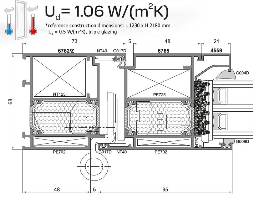 Tepelná izolace PE68: U od 2,1 W/(m²K), U od 1,13 W/(m²K) (f, d)
