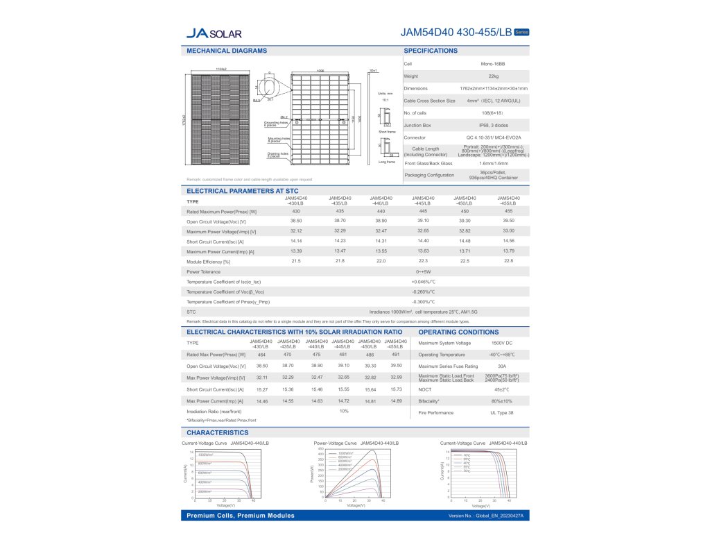 Bifaciální modul ze skla typu N od společnosti JA Solar s účinností 22,5 % a výkonem 450 W. Modul JAM54D40 450/LB je vybaven nejnovější generací DeepBlue 4.0 Pro a technologií N-Type, což má za výsledek dlouhou životnost, vysokou účinnost, lepší výkon a nižší teplotní koeficient. Tento bifaciální fotovoltaický modul s Double Glass má 12-letou záruku na výrobek a 30-letou záruku na výkon od výrobce.
