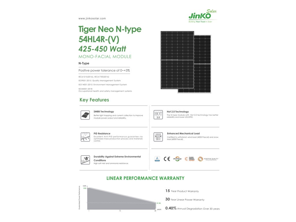 Jinko Tiger Neo N-type je nejnovější z prémiových panelů, které nabízejí vynikající funkce a technologie nové generace, včetně: