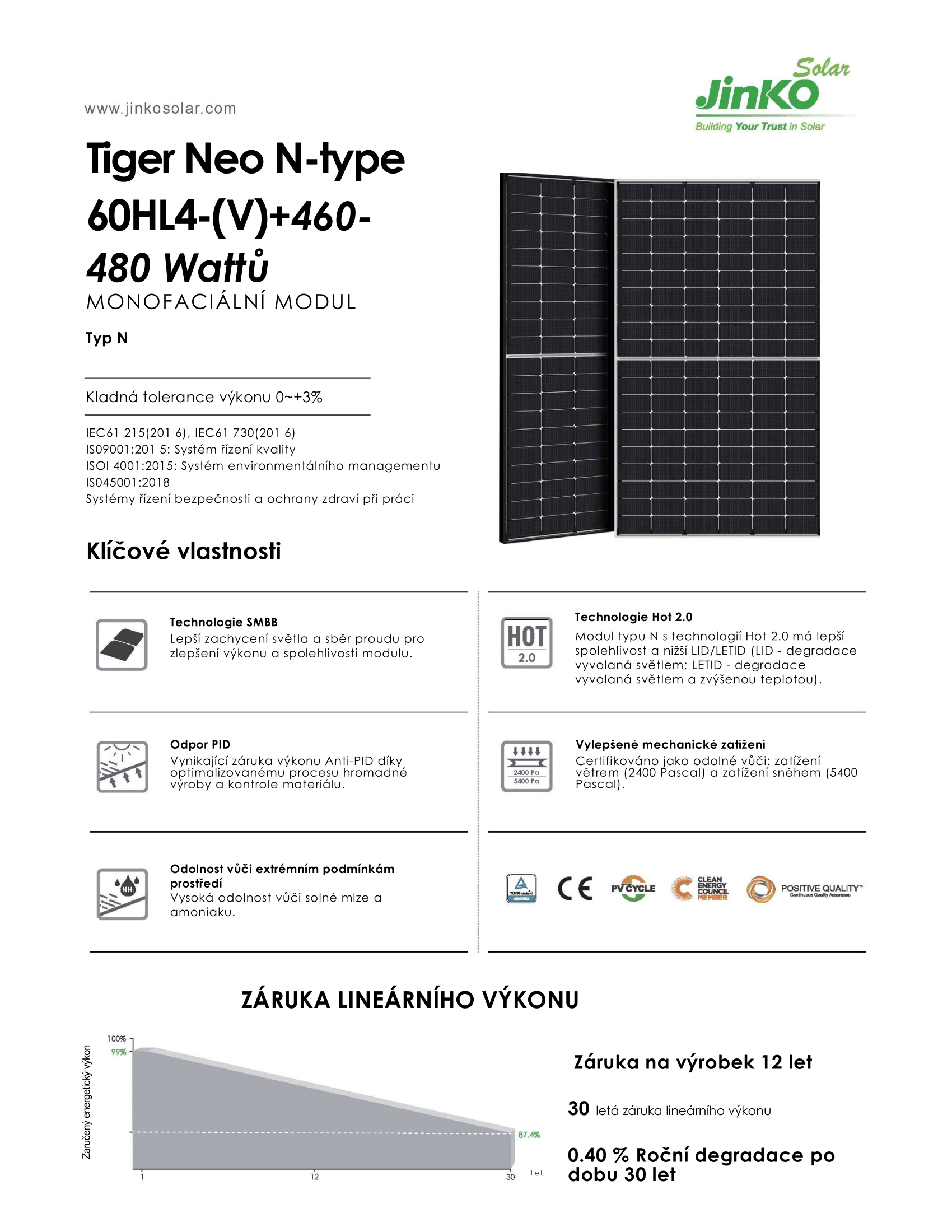 Jinko Tiger Neo N-type 60HL4-(V) 480W je nejnovější z prémiových panelů, které nabízejí vynikající funkce a technologie nové generace, včetně: