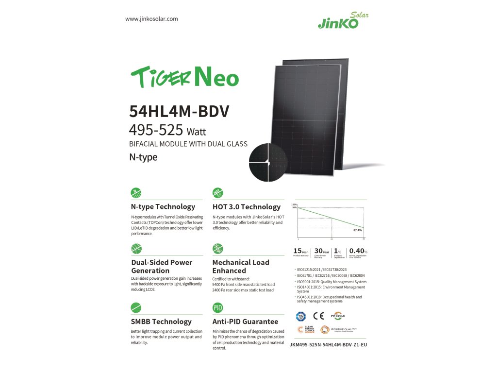 Jinko Solar Tiger Neo 54HL4M-BDV je bifaciální solární panel nové generace s duálním sklem a technologií N-type TOPCon, který nabízí špičkový výkon, dlouhou životnost a vyšší energetický zisk díky oboustranné výrobě elektřiny. Patří mezi nejmodernější řešení na trhu, ideální pro rezidenční i komerční instalace.
