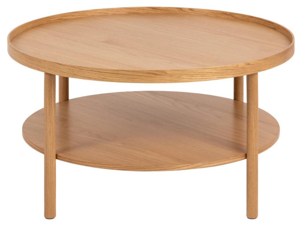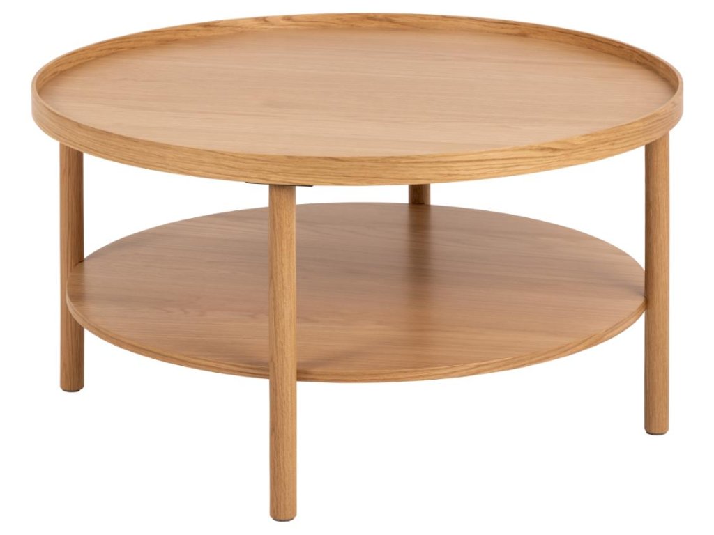 Dvoupatrový konferenční stolek pro tradiční i moderní obývací pokoje Kulatá deska s povrchem z dubové dýhy a zvýšeným okrajem Obsahuje poličku na časopisy Kulaté lakované dubové nohy, které doplňují desku Dánský design chráněný výhradně pro společnost Actona Certifikát FSC™