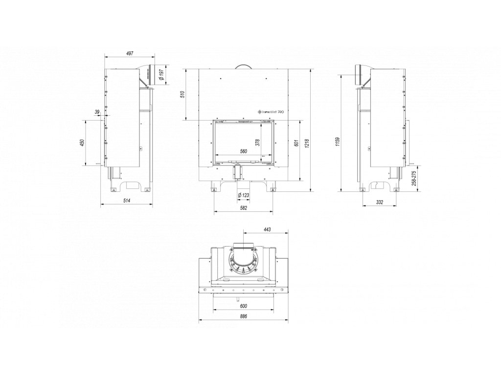 Vložka je ve standartní verzi s jednoduchým prosklením v designu glass. Velká spalovací komora s vystýlkou Acumotte. Vložka je bez roštu – úplné spálení dřeva na nejjemnější popel. Spodní deska topeniště je výrazně snížena oproti dvířkám (palivo je umístěno pod ohradníkem a vzduchovou lištou). Dvířka vyrobená z uzavřeného profilu díky tomu jsou stabilnější a odolnější k pnutí při provozu za vysokých teplot