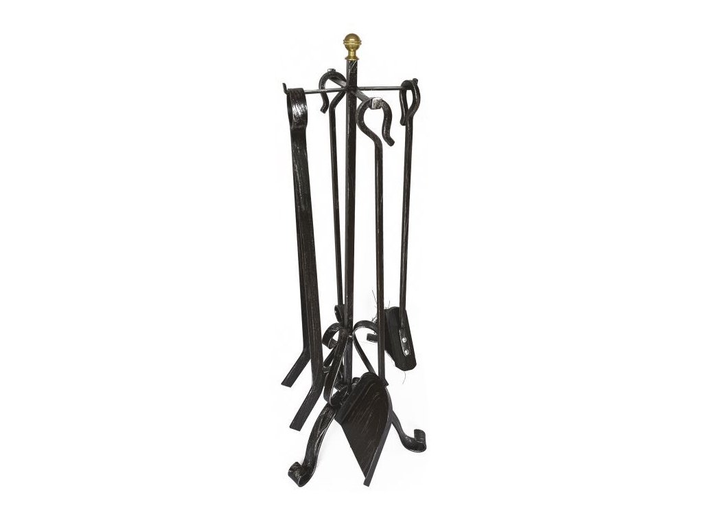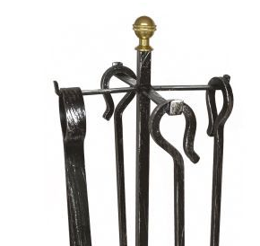 Materiál nářadí železo/ocel. Součásti soupravy: smetáček, lopatka, kleště a pohrabáč. Stojan pro nářadí ozdoben mosaznou koulí.