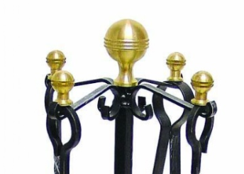 Materiál nářadí železo/ocel. Součásti soupravy: smetáček, lopatka, kleště a pohrabáč. Stojan pro nářadí ozdoben mosaznou koulí.