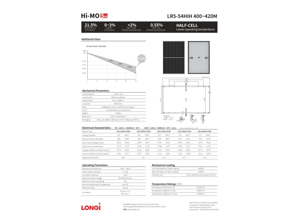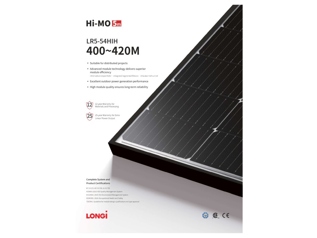 Tento panel je ideální volbou pro zákazníky, kteří hledají vyšší výkon, spolehlivost a moderní design. Díky technologii Hi-MO 5m a optimalizaci pro reálné podmínky dosahuje skvělých výsledků i při nižší intenzitě osvitu.