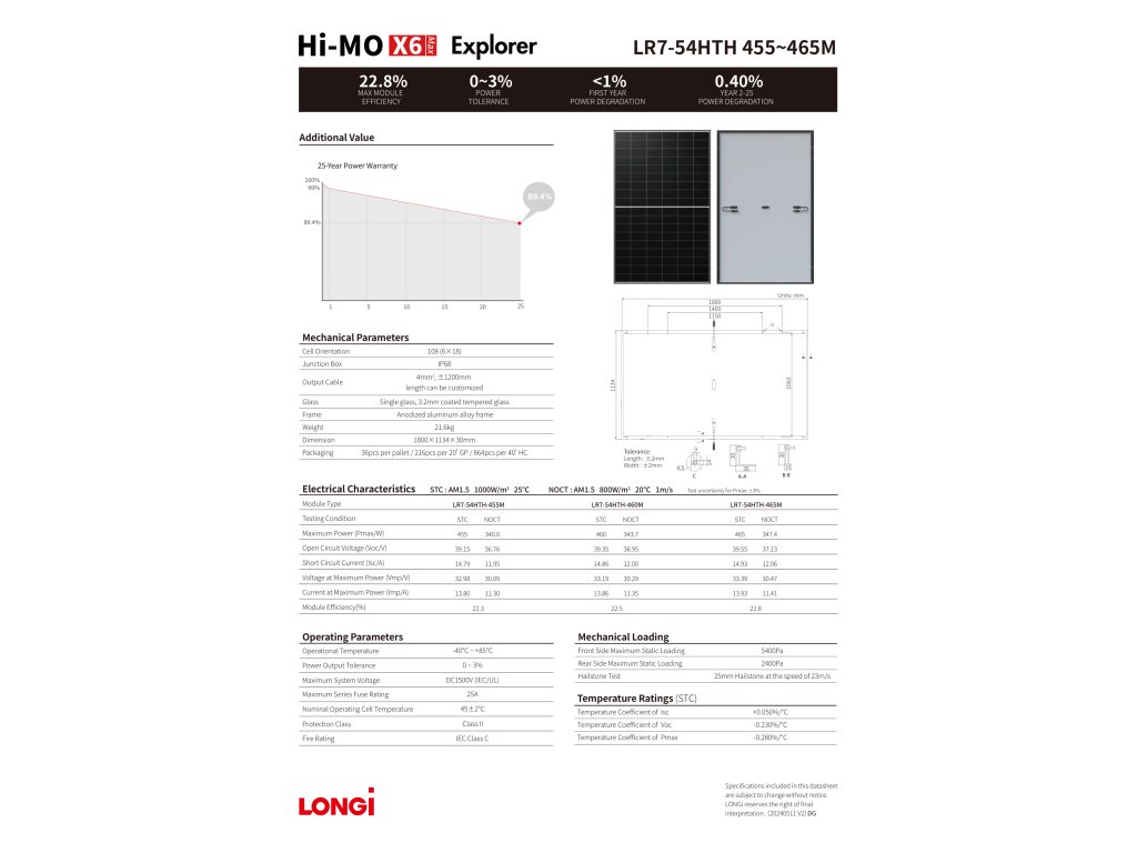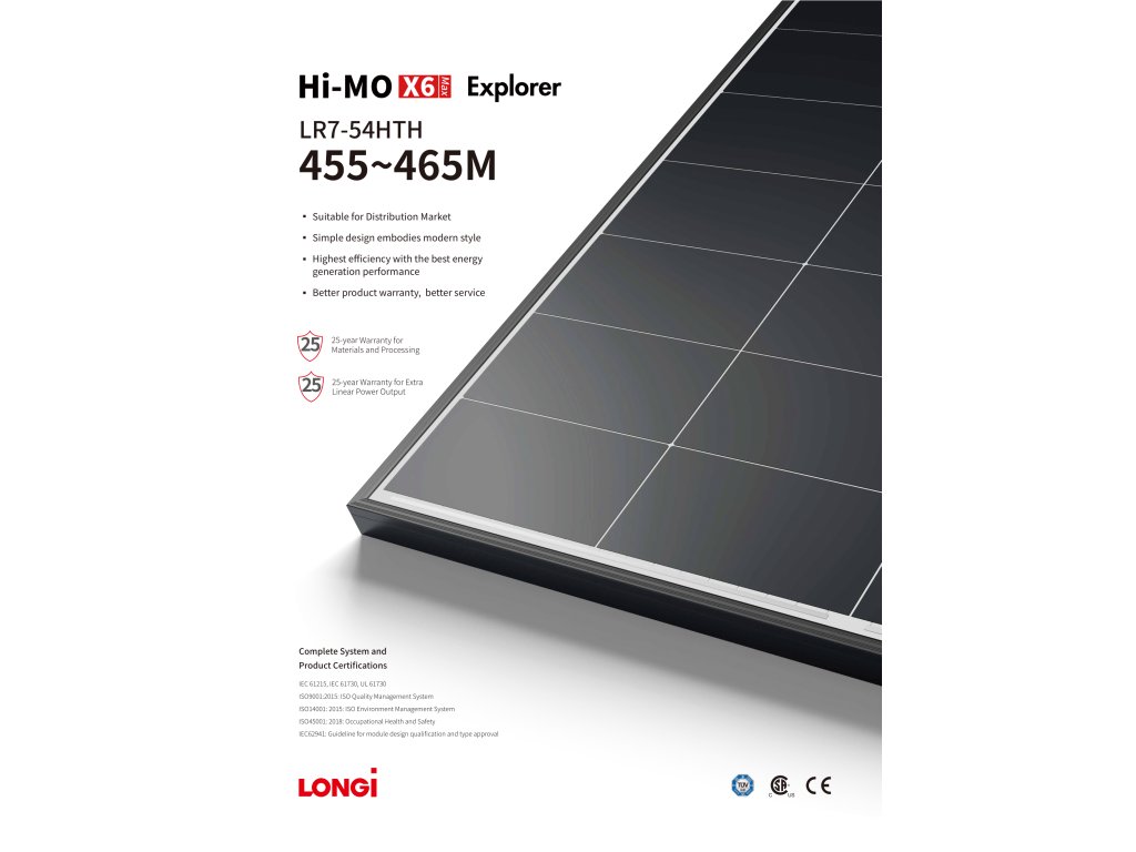 LONGi Hi-MO X6 Max Explorer LR7-54HTH-460M je vysoce výkonný solární modul navržený pro výjimečnou eleganci a energetickou účinnost. Tento model s maximálním výkonem 460 Wp a působivou účinností modulu 22,5 % vyniká designem, který dodá estetický vzhled ke každé instalaci. Jedná se o monofaciální modul s bílou zadní deskou a černým eloxovaným rámem.