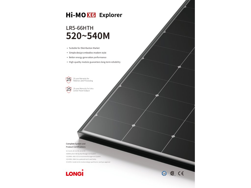 LONGi Hi-MO6 Explorer LR5-66HTH-520M je vysoce výkonný solární modul navržený pro výjimečnou eleganci a energetickou účinnost. Tento model s maximálním výkonem 520 Wp a působivou účinností modulu 21,9 % vyniká designem, který dodá estetický vzhled ke každé instalaci. Jedná se o monofázový modul s bílou zadní deskou a černým eloxovaným rámem.