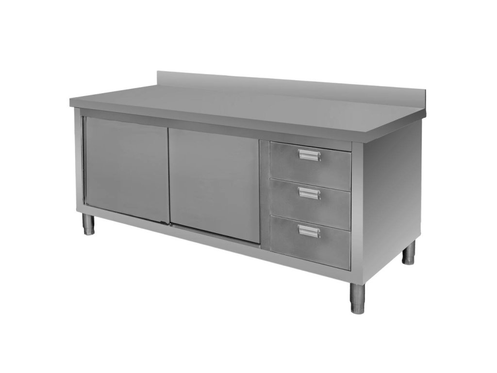 Profesionální nerezový stůl přináší robustní konstrukci, elegantní design a maximální praktičnost. Výbava uzamykatelnou skříňkou a třemi zásuvkami zajišťuje dokonalou organizaci pracovního prostoru v náročných gastronomických provozech.Klíčové vlastnosti
