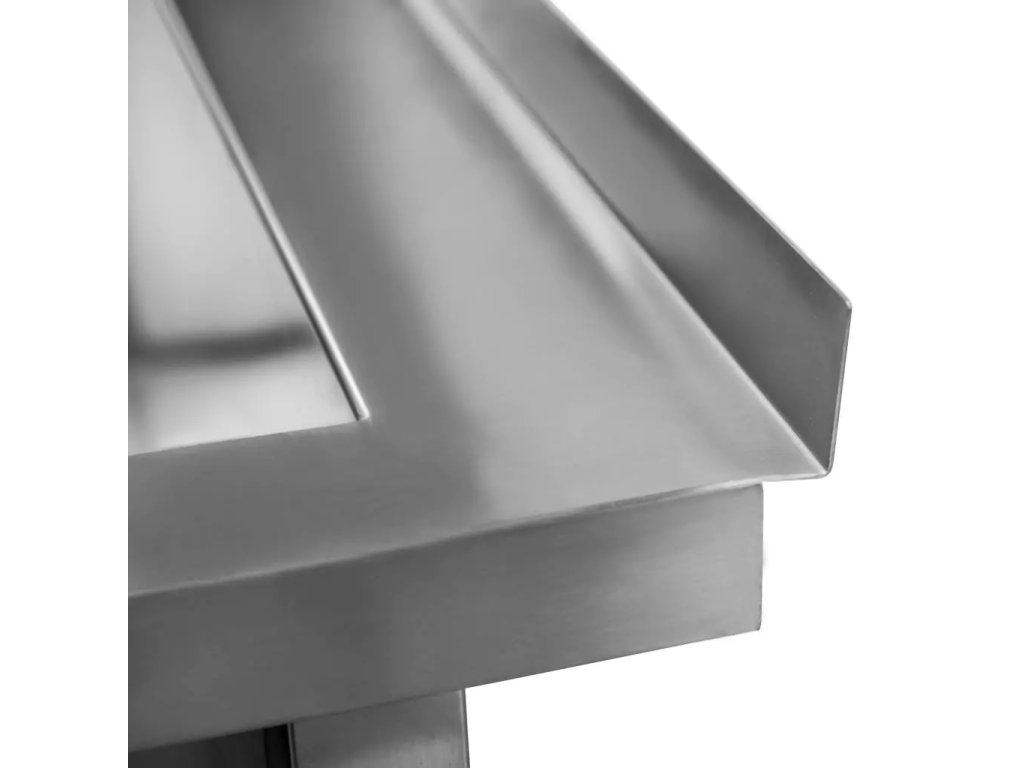 Dřez je vybaven ochranným okrajem, který brání stříkající vodě, tvarovaným dnem pro rychlý odtok, nastavitelnými nožkami pro stabilitu i na nerovném povrchu, a čelním krytem, který zakrývá spodní část konstrukce. Dodává se kompletně smontovaný, připravený k okamžitému použití.