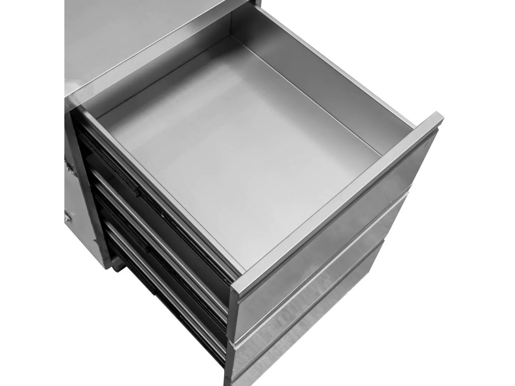 Levá strana stolu obsahuje tři hluboké zásuvky s plynulým rolovacím vedením pro rychlý přístup k veškerému náčiní. Spodní otevřená police poskytuje dodatečný úložný prostor pro větší nádoby nebo zásoby.