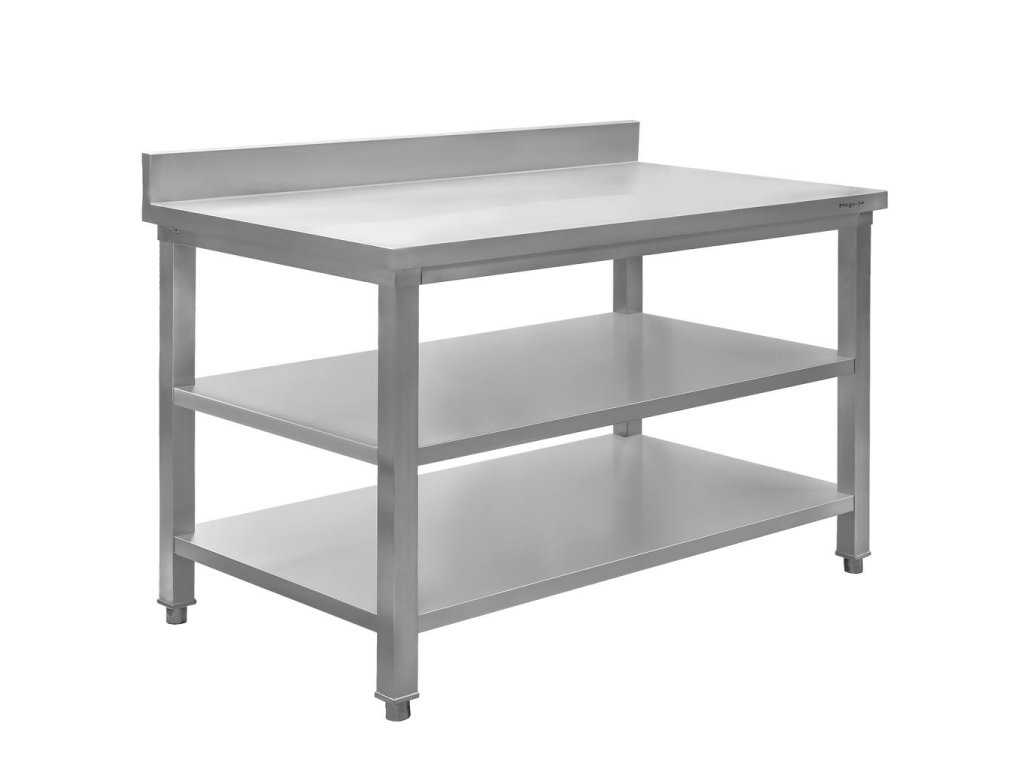 Nerezový pracovní stůl s okrajem a dvěma policemi – praktická volba pro profesionální provozTento pracovní stůl z nerezové oceli AISI 304 nabízí dlouhou pracovní plochu, dvě prostorné police a vysoký okraj (10 cm), který chrání okolní stěny před nečistotami. Konstrukce z vysoce kvalitních materiálů je odolná vůči intenzivnímu používání, snadno se čistí a je schválená pro styk s potravinami. Díky čtyřem stabilním nohám s možností výškového nastavení se stůl snadno přizpůsobí každému prostředí.