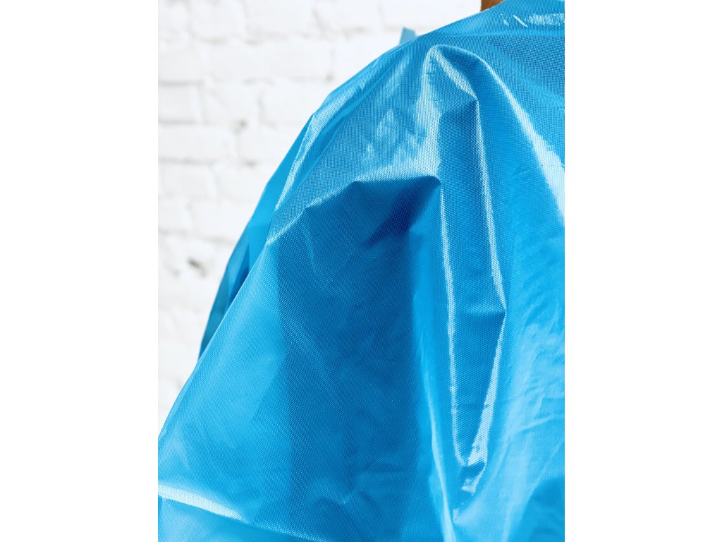 Jednorázový overal z plastu CPE v modré barvě, rukávy v koncích s dírkou na palec, oblek se šňůrkami , oblek váží 54g