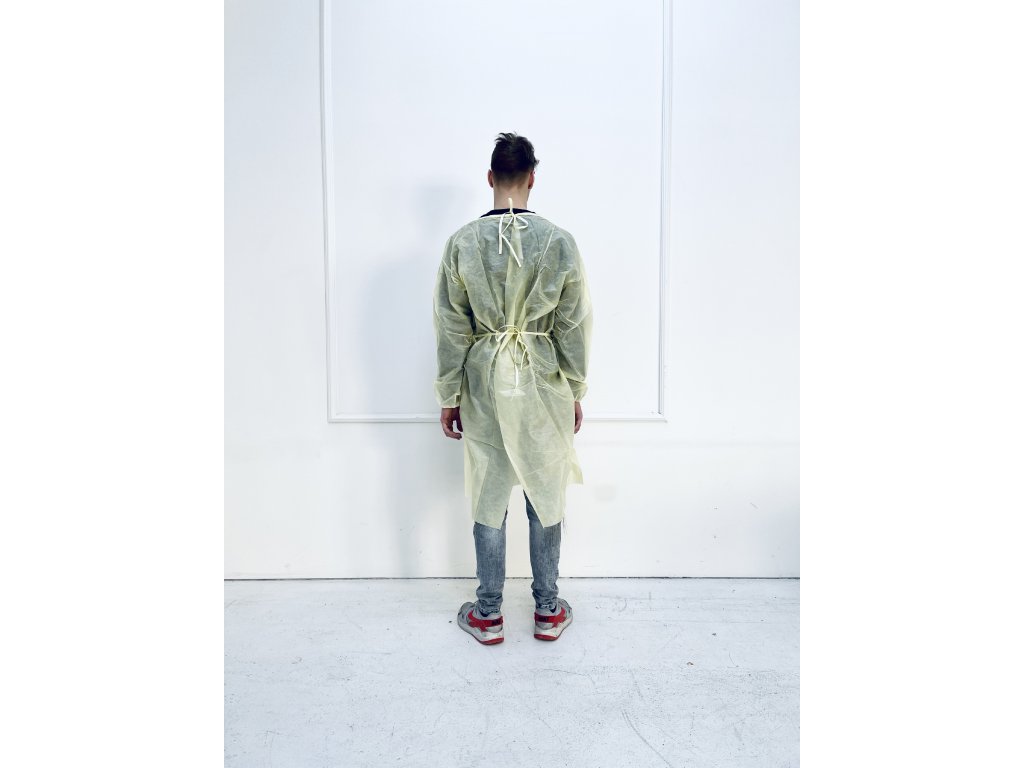 Jednorázový overal ze 100% netkané textilie ve žluté barvě, rukávy v koncích s gumičkou, oblek se šňůrkami, materiál 25g/m2.