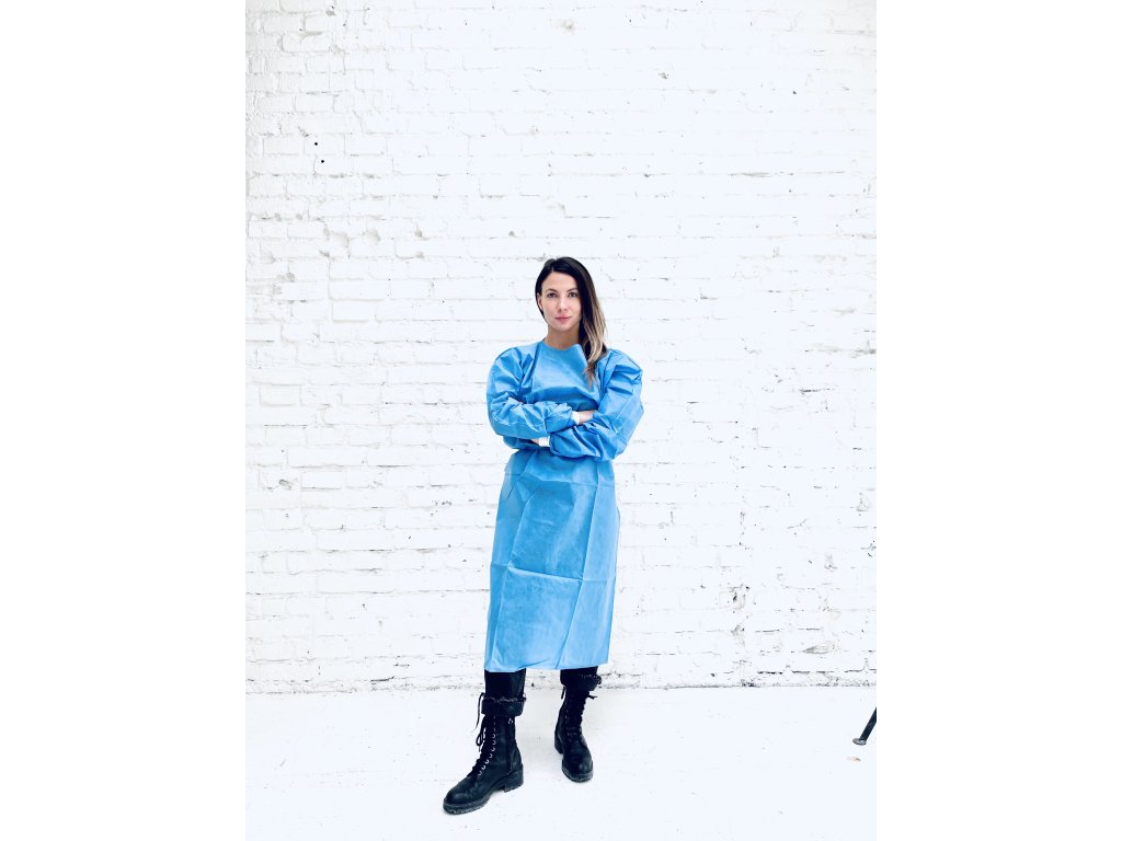 Jednorázový oblek ze 100% netkané textilie SMS v modré barvě, rukávy v koncích s rukávem, oblek se šňůrkami, materiál 40g/m2.