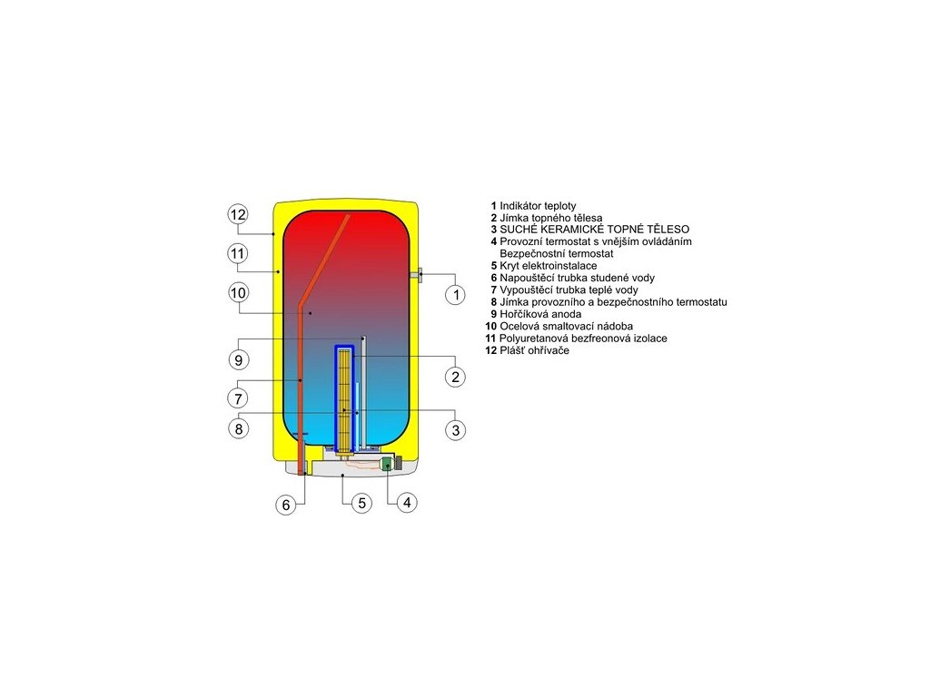 Svislý elektrický ohřívač vody s keramickým topným tělesem a možností instalace v blízkosti odběrných míst.