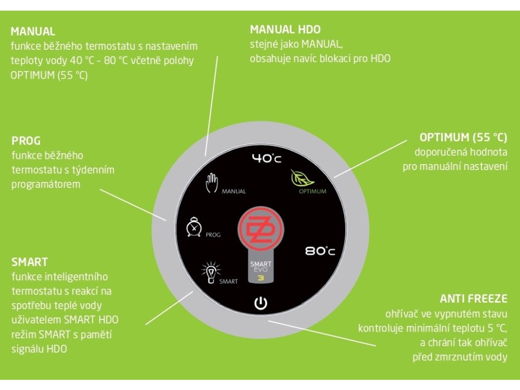 Ohřívač je určen k tzv. akumulačnímu ohřevu vody elektrickou energií. Vodu ohřívá elektrické těleso ve smaltovaném, tepelně izolovaném zásobníku. Těleso je v době ohřevu ovládáno řídící jednotkou. Pomocí kruhového ovladače otočením doleva nebo doprava lze přepínat mezi jedním ze čtyř režimů.