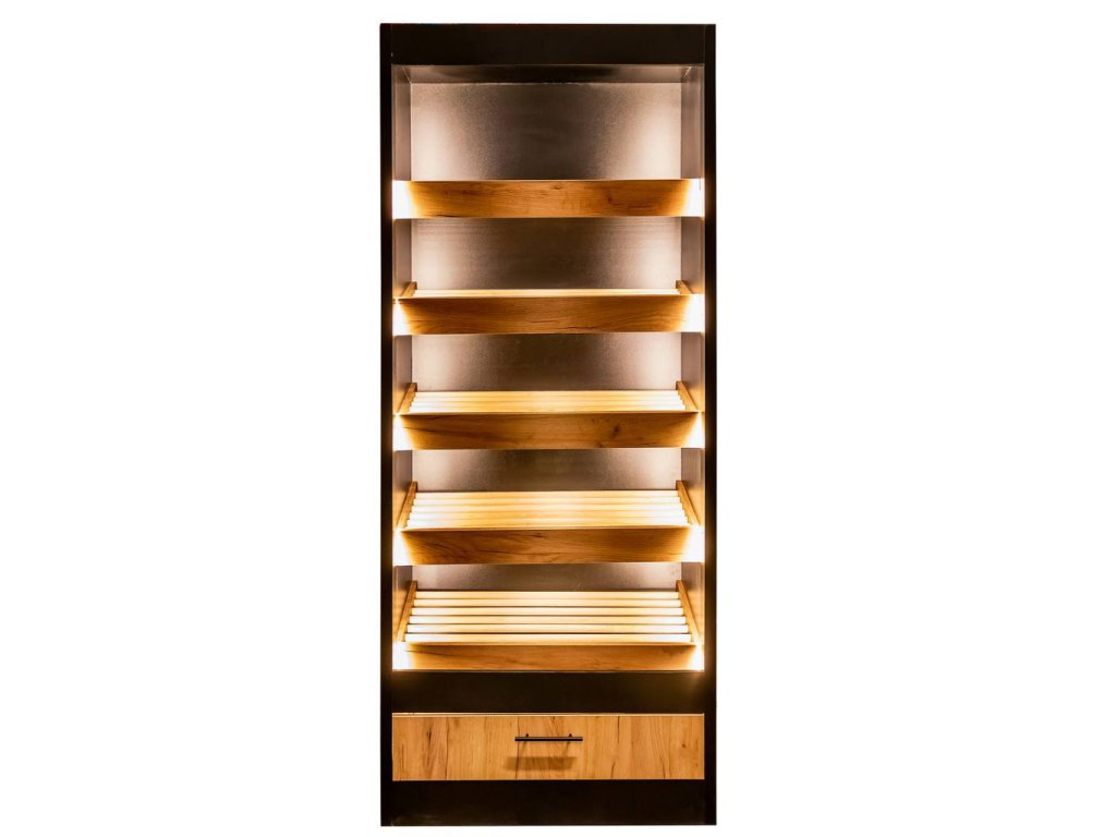 - Dřevěné police se zarážkami chránící výrobky před vypadnutím