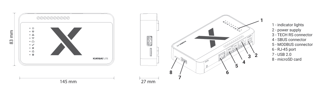 - Vstupy: 1x USB 2.0, slot MicroSD, 2x RS-485 (SBUS, Modbus), síťové rozhraní RJ-45, 1x TECH RS