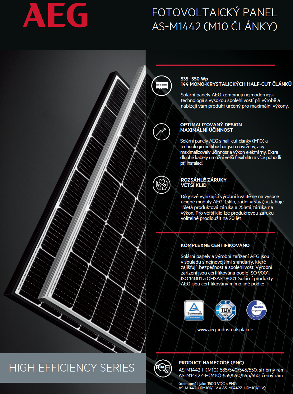 Solární panely AEG řady High Efficiency jsou navrženy tak, aby maximalizovaly účinnost a výkon elektrárny. Technologie článků half-cut a užití multibusbar zajišťují, že přeměna slunečního světla je maximalizována pro optimální výnosy. Extra dlouhé kabely, poskytují extra flexibilitu a pohodlí při instalaci.