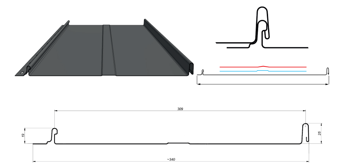 - Montážní otvory rozmístěné podél stojatého zámku umožňují překrýt upevňovací šrouby sousedícím panelem, čímž se zachovává estetika střešní krytiny.