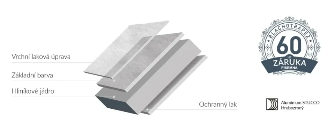 Aluzinek plech s oboustrannou povrchovou úpravou slitiny hliníku a zinku. Procento obsahu slitiny je: hliník 55%, zinek 43,4%, křemík 1,6%, což umožnuje dosáhnout vysokou korozní odolnost prostřednictvím synergického účinku katodické ochrany zinku a ochranného efektu hliníku. Používáme jen plech s obsahem aluzinku o hmotnosti 185 g / m² (produkt s 25-letou zárukou). Aluzinek splňuje požadavky třídy A1 podle rozhodnutí Komise 96/603 / EC o požární ochraně a muže být použit v třídě koroznosti C4 v souladu s normou EN ISO 12944-2.