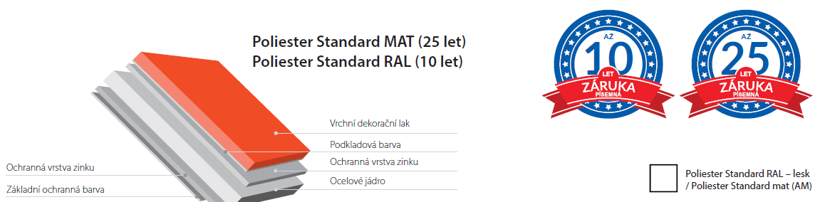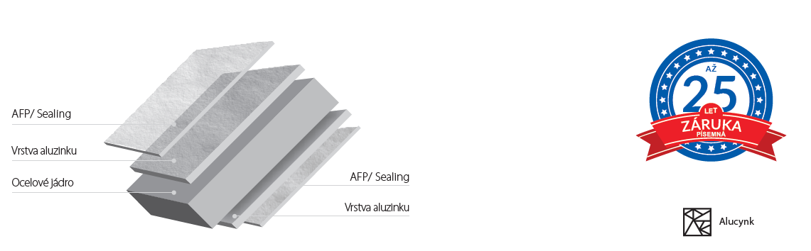 Aluzinek plech s oboustrannou povrchovou úpravou slitiny hliníku a zinku. Procento obsahu slitiny je: hliník 55%, zinek 43,4%, křemík 1,6%, což umožnuje dosáhnout vysokou korozní odolnost prostřednictvím synergického účinku katodické ochrany zinku a ochranného efektu hliníku. Používáme jen plech s obsahem aluzinku o hmotnosti 185 g / m² (produkt s 25-letou zárukou). Aluzinek splňuje požadavky třídy A1 podle rozhodnutí Komise 96/603 / EC o požární ochraně a muže být použit v třídě koroznosti C4 v souladu s normou EN ISO 12944-2.