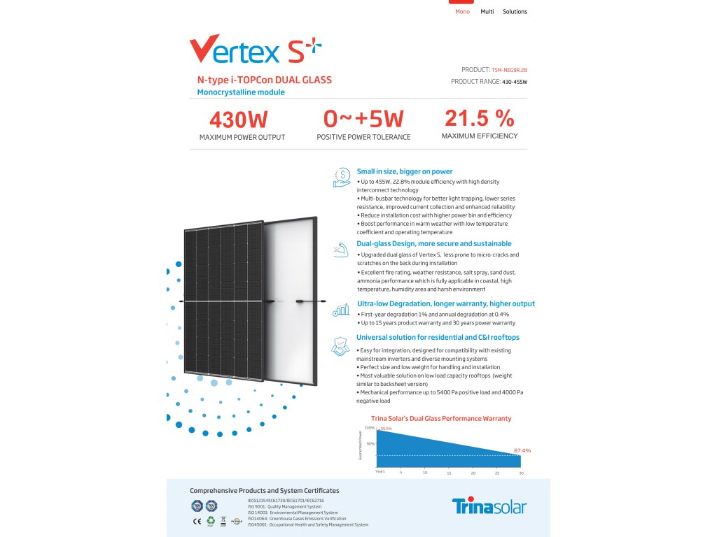 Fotovoltaický modul Trina 435 W z řady Vertex S+ je vyroben z monokrystalických článků s technologii i-TOPcon typu N. Modul Vertex S+ má několik inovativních konstrukčních prvků, které umožňují dosáhnout vysokého výstupního výkonu. Dokonalý teplotní koeficient a nízká účinnost ozáření zajišťují ještě vyšší výkon. Navíc díky zapojení s vysokou hustotou může účinnost Vertex S + dosáhnout až 21,8 %.