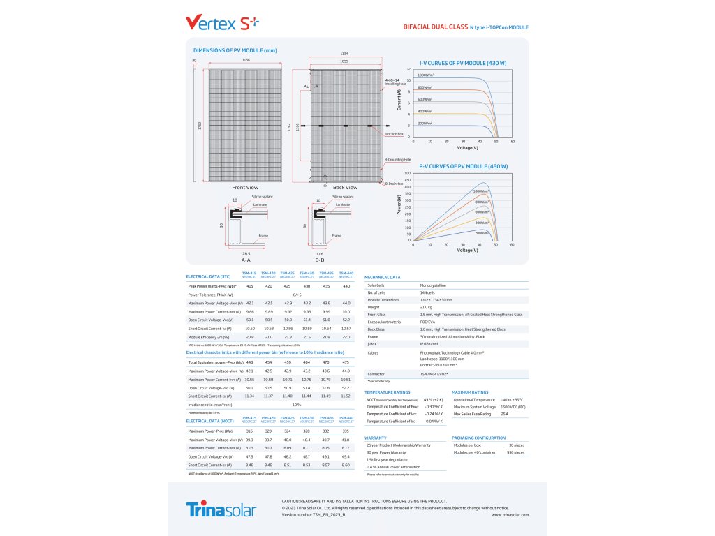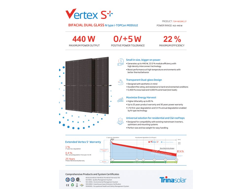 Fotovoltaický modul Trina 440 W z řady Vertex S+ Bifacial je vyroben z monokrystalických článků s technologii i-TOPcon typu N. Modul Vertex S+ má několik inovativních konstrukčních prvků, které umožňují dosáhnout vysokého výstupního výkonu. Dokonalý teplotní koeficient a nízká účinnost ozáření zajišťují ještě vyšší výkon. Navíc díky zapojení s vysokou hustotou může účinnost Vertex S + dosáhnout až 22 %.