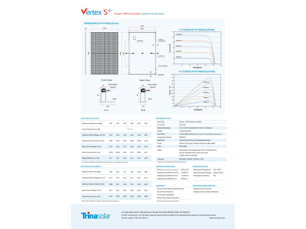Fotovoltaický modul Trina 445 W z řady Vertex S+ je vyroben z monokrystalických článků s technologii i-TOPcon typu N. Modul Vertex S+ má několik inovativních konstrukčních prvků, které umožňují dosáhnout vysokého výstupního výkonu. Dokonalý teplotní koeficient a nízká účinnost ozáření zajišťují ještě vyšší výkon. Navíc díky zapojení s vysokou hustotou může účinnost Vertex S + dosáhnout až 22,3 %.