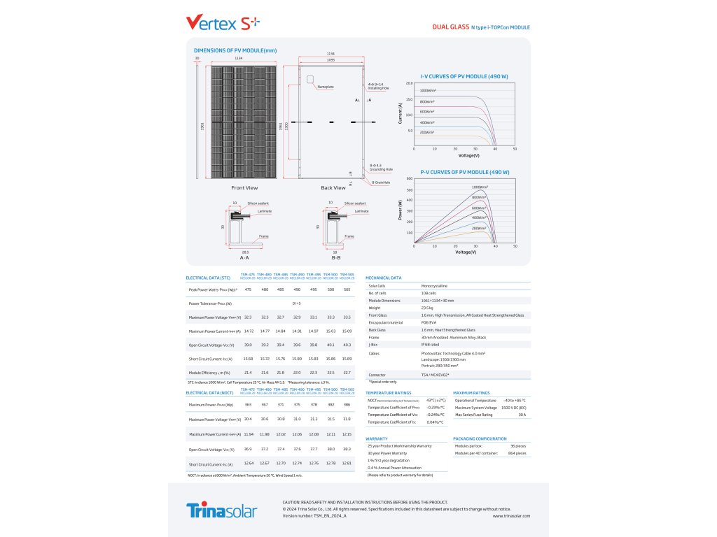 Fotovoltaický modul Trina 500 W z řady Vertex S+ je vyroben z monokrystalických článků s technologii i-TOPcon typu N. Modul Vertex S+ má několik inovativních konstrukčních prvků, které umožňují dosáhnout vysokého výstupního výkonu. Dokonalý teplotní koeficient a nízká účinnost ozáření zajišťují ještě vyšší výkon. Navíc díky zapojení s vysokou hustotou může účinnost Vertex S + dosáhnout až 22,5 %.
