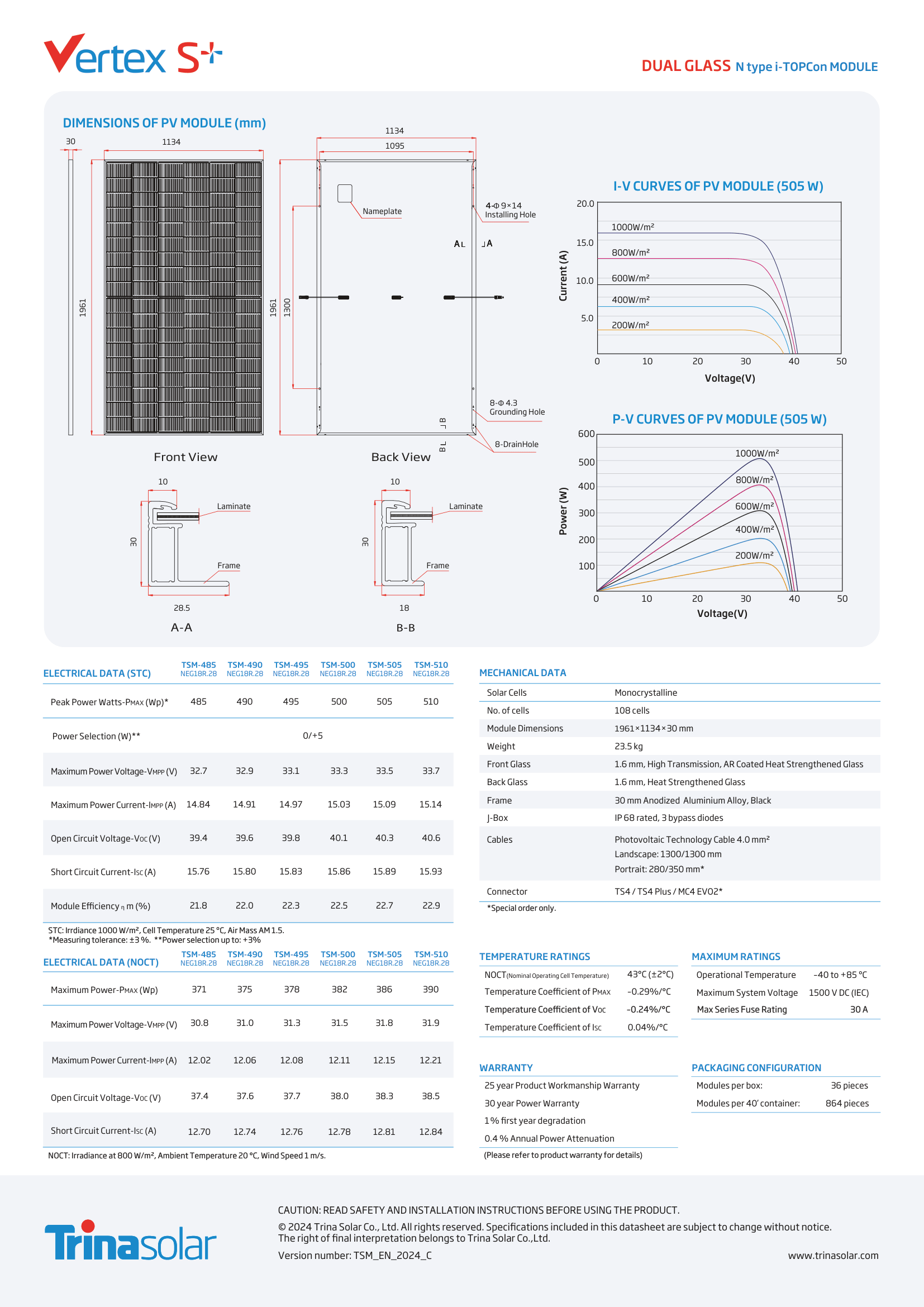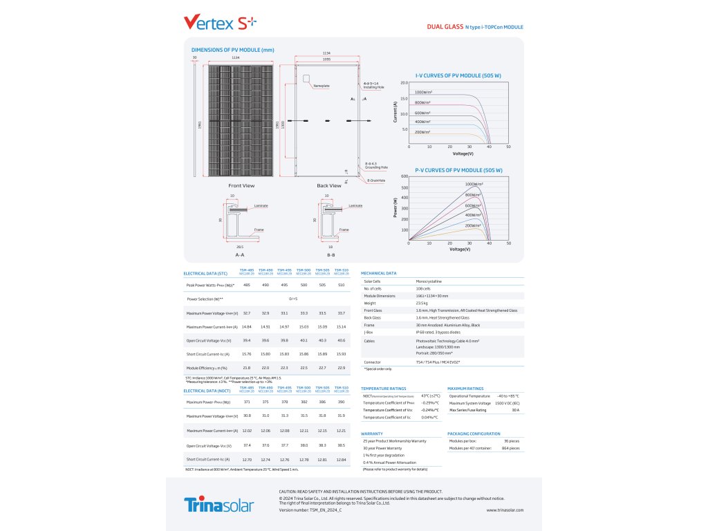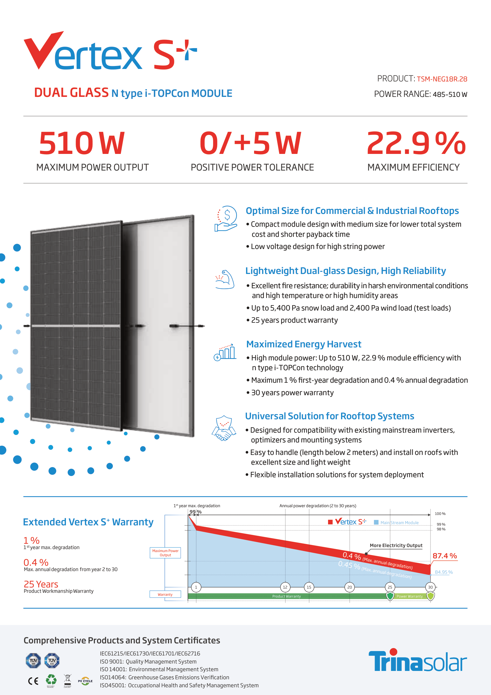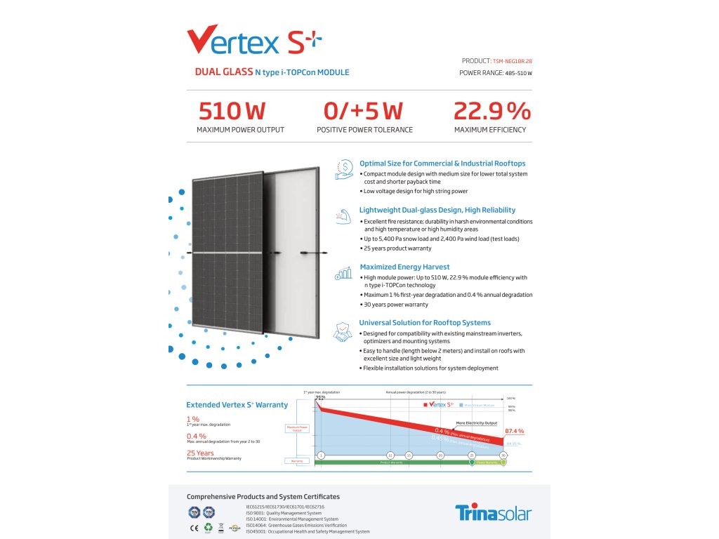 Fotovoltaický modul Trina 510 W z řady Vertex S+ je vyroben z monokrystalických článků s technologii i-TOPcon typu N. Modul Vertex S+ má několik inovativních konstrukčních prvků, které umožňují dosáhnout vysokého výstupního výkonu. Dokonalý teplotní koeficient a nízká účinnost ozáření zajišťují ještě vyšší výkon. Navíc díky zapojení s vysokou hustotou může účinnost Vertex S + dosáhnout až 22,9%.