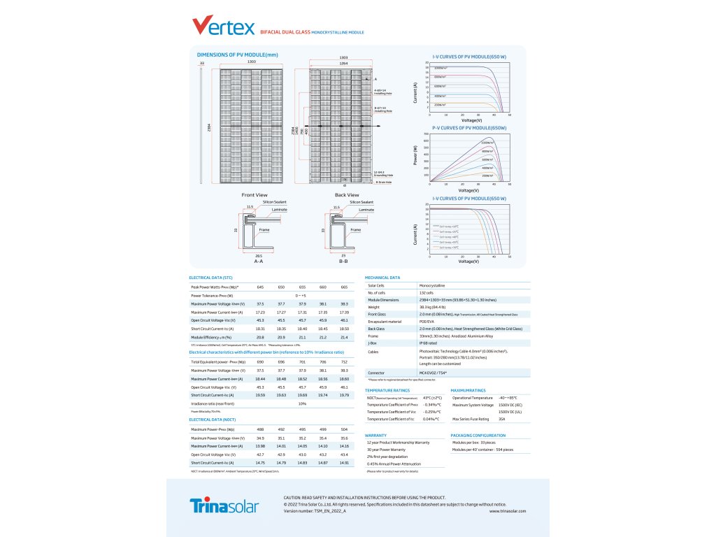 Panel Trina Vertex 650 W Bifacial je sestaven ze 132 monokrystalických článků PERC v technologii Half-Cut a je ideální pro instalace s periodickým částečným zastíněním. Rozdělení na polovinu navíc snižuje schopnost modulu zahřívat se, což vede k vyššímu výkonu. Výrobek je umístěn v eloxovaném hliníkovém rámu o tloušťce 30 mm a z obou stran je pokryt 2mm skleněnými tabulemi. Přední sklo s vysokou propustností má speciální antireflexní vrstvu AR, zadní sklo je tepelně zesílené.
