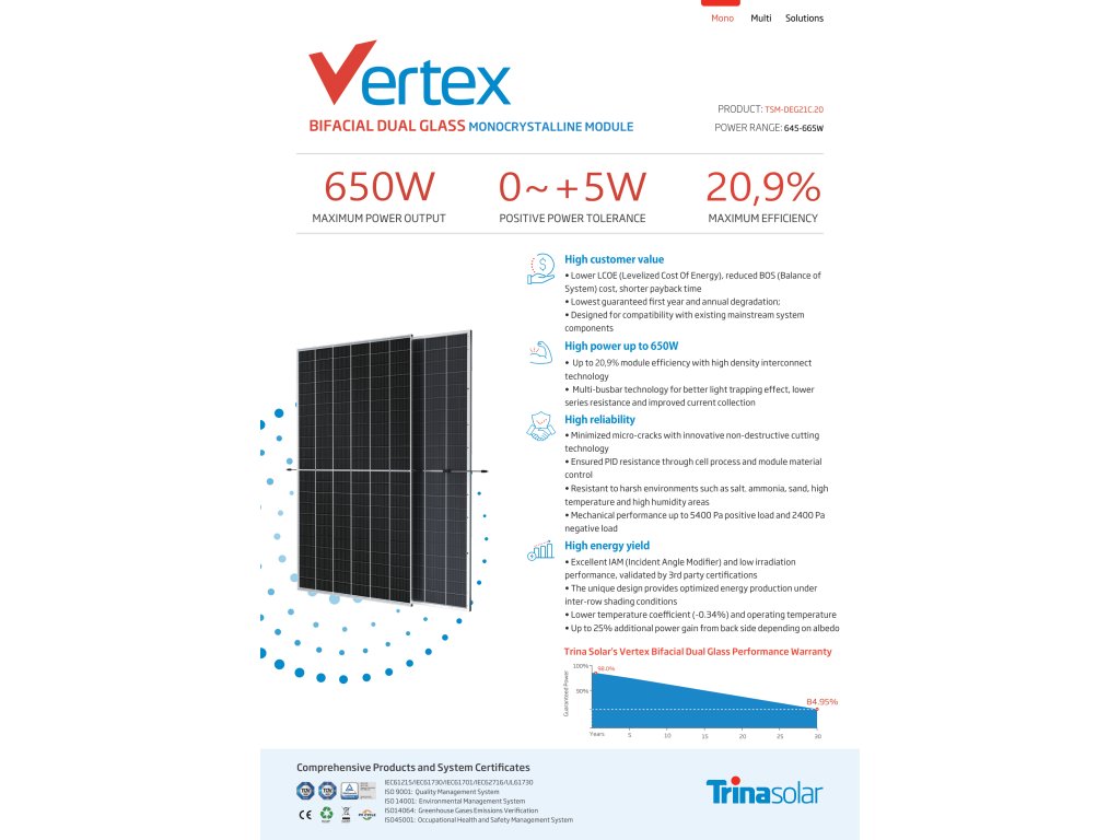 Modul Trina Vertex Bifacial je oboustranný fotovoltaický panel, který při optimalizaci úhlu montáže maximalizuje přední i zadní výkon panelu. Díky oboustrannému vystavení slunečnímu záření snižuje náklady na výrobu energie po celý rok a urychluje návratnost investic zákazníků. Panel dosahuje až 20,9 % účinnosti.