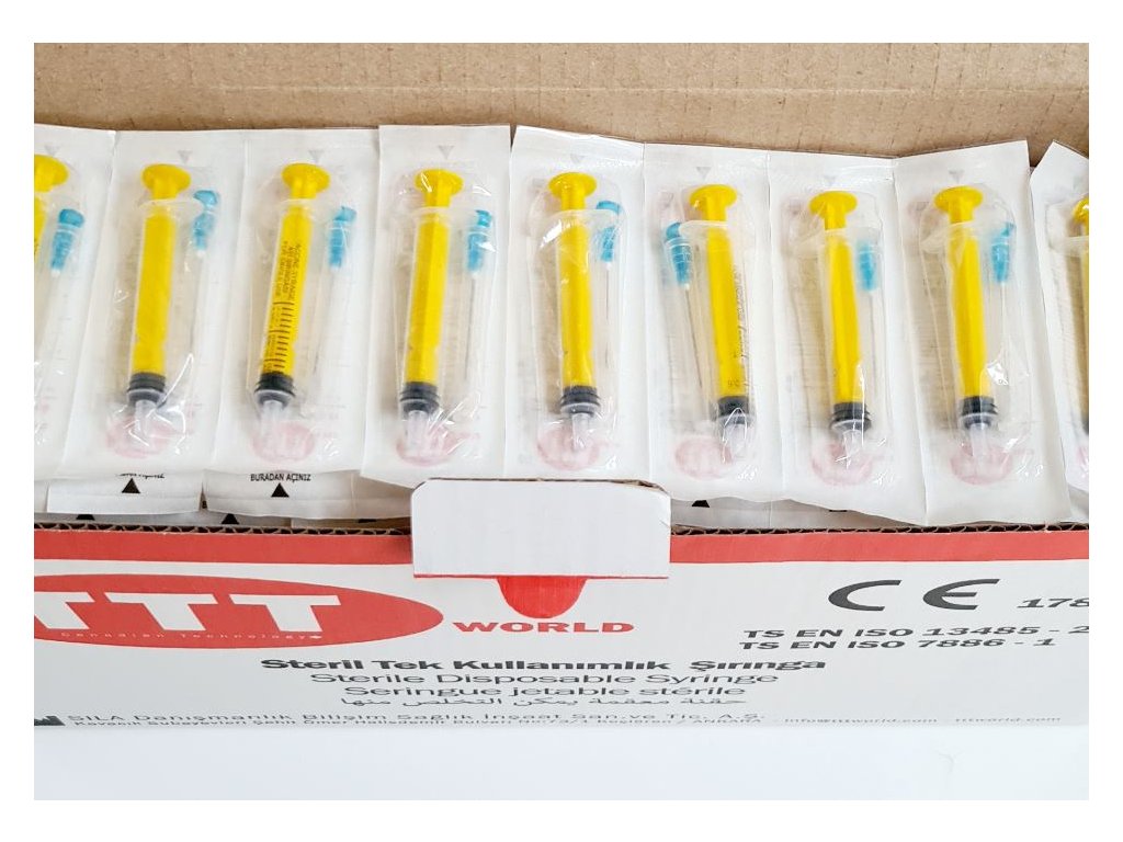 Materiály „Medical Grade“ polypropylen, farmaceutické gumová / latexová víčka, injekční vstřikovaný farmaceutický píst a tělo vyrobené z polypropylenové suroviny, těsnění namontované na pístu. Po odstranění jehel se jehly a stříkačky shromažďují pro proces sterilizace ethylenoxidem.