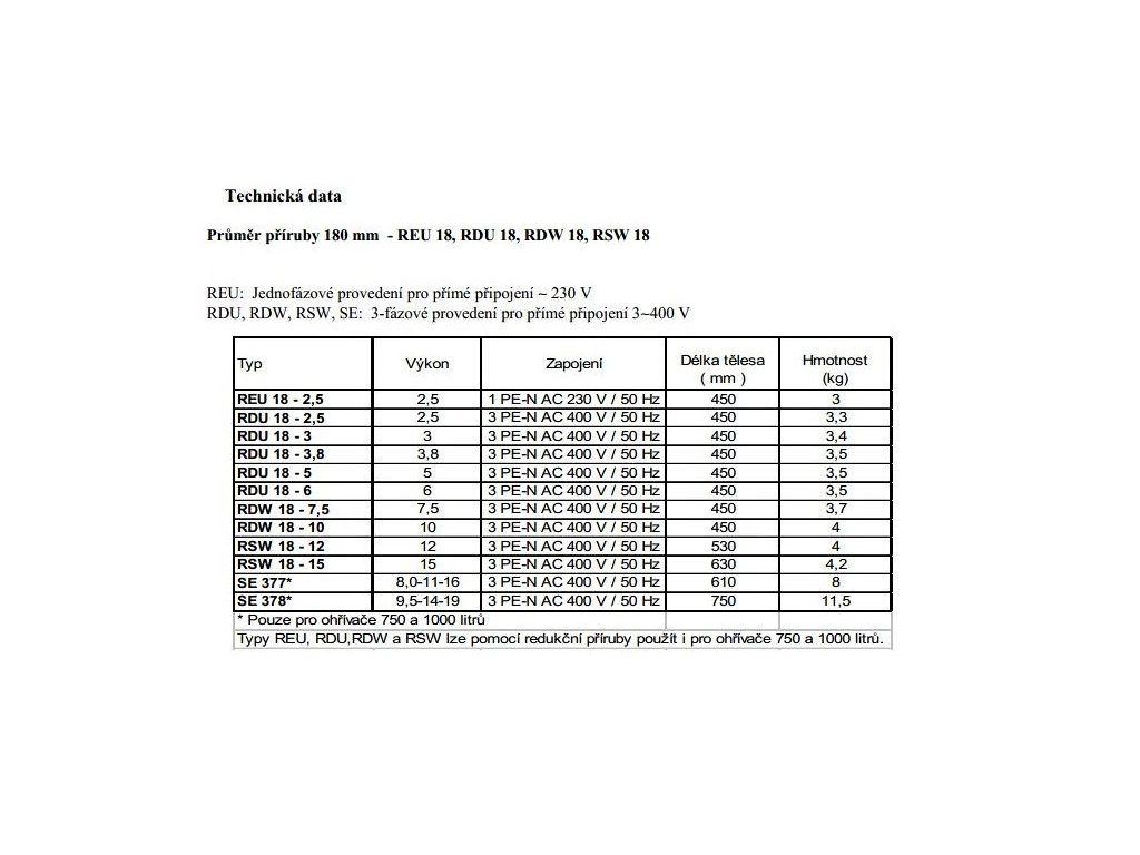 Typ SE 378 s volitelným výkonem v rozsahu 8–11–16 kW je určen pouze pro ohřívače objemů 750 litrů a 1000 litrů.